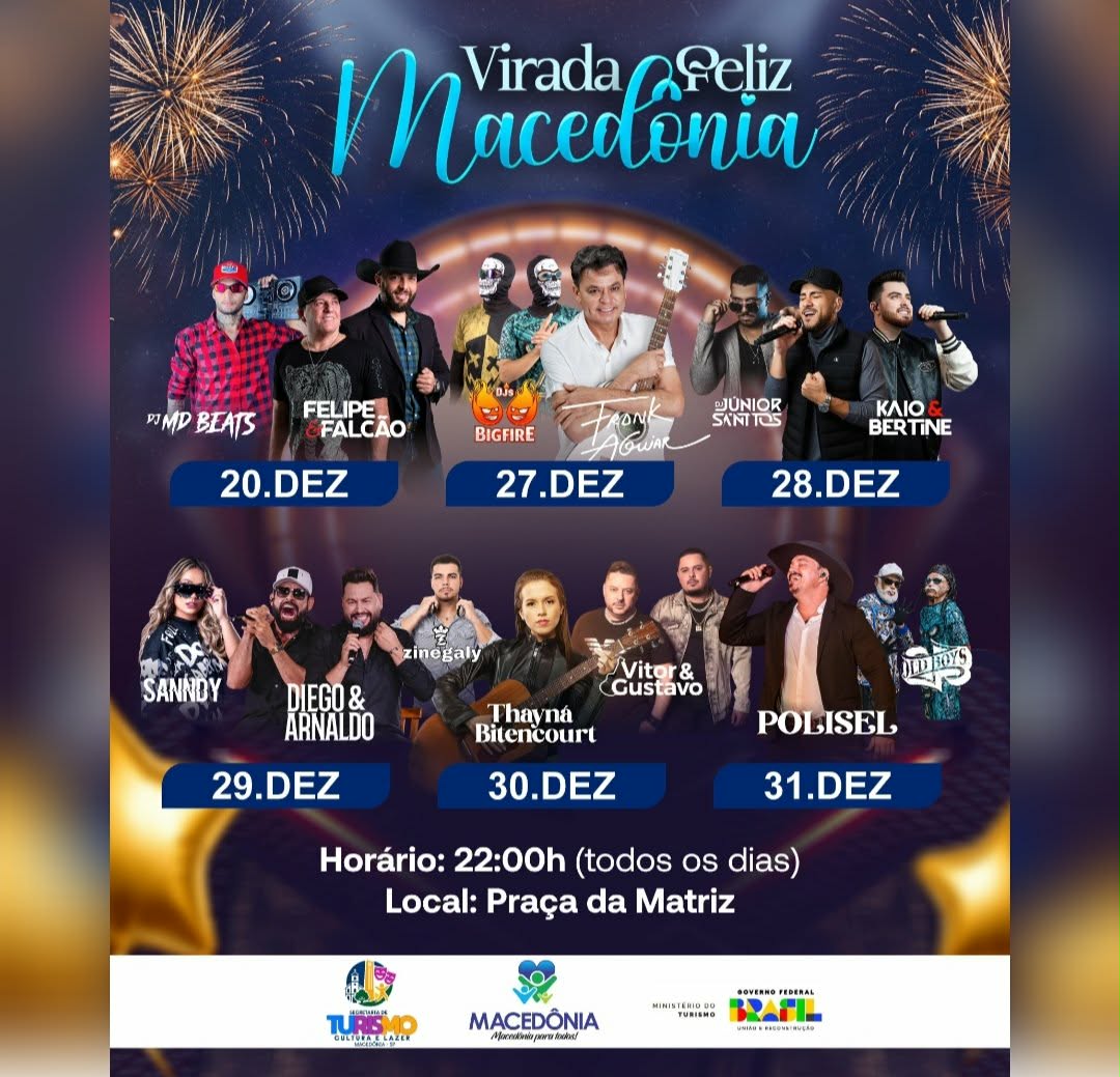 Macedônia já está em clima de festa e se prepara para viver uma das maiores celebrações de fim de ano da sua história. A Virada Feliz Macedônia chega com uma programação especial, reunindo grandes nomes da música, diversidade de estilos e muita animação para celebrar o encerramento de 2025 e a chegada de 2026 com alegria, união e esperança.