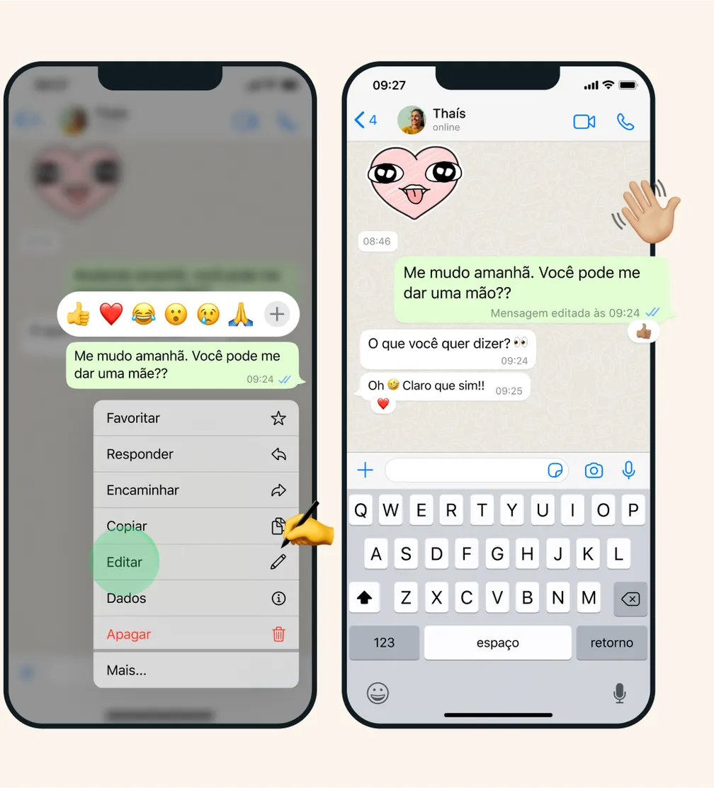 A opção de editar ficará disponível até 15 minutos depois do envio da mensagem. Essas mensagens serão exibidas com a palavra “editada” ao lado.